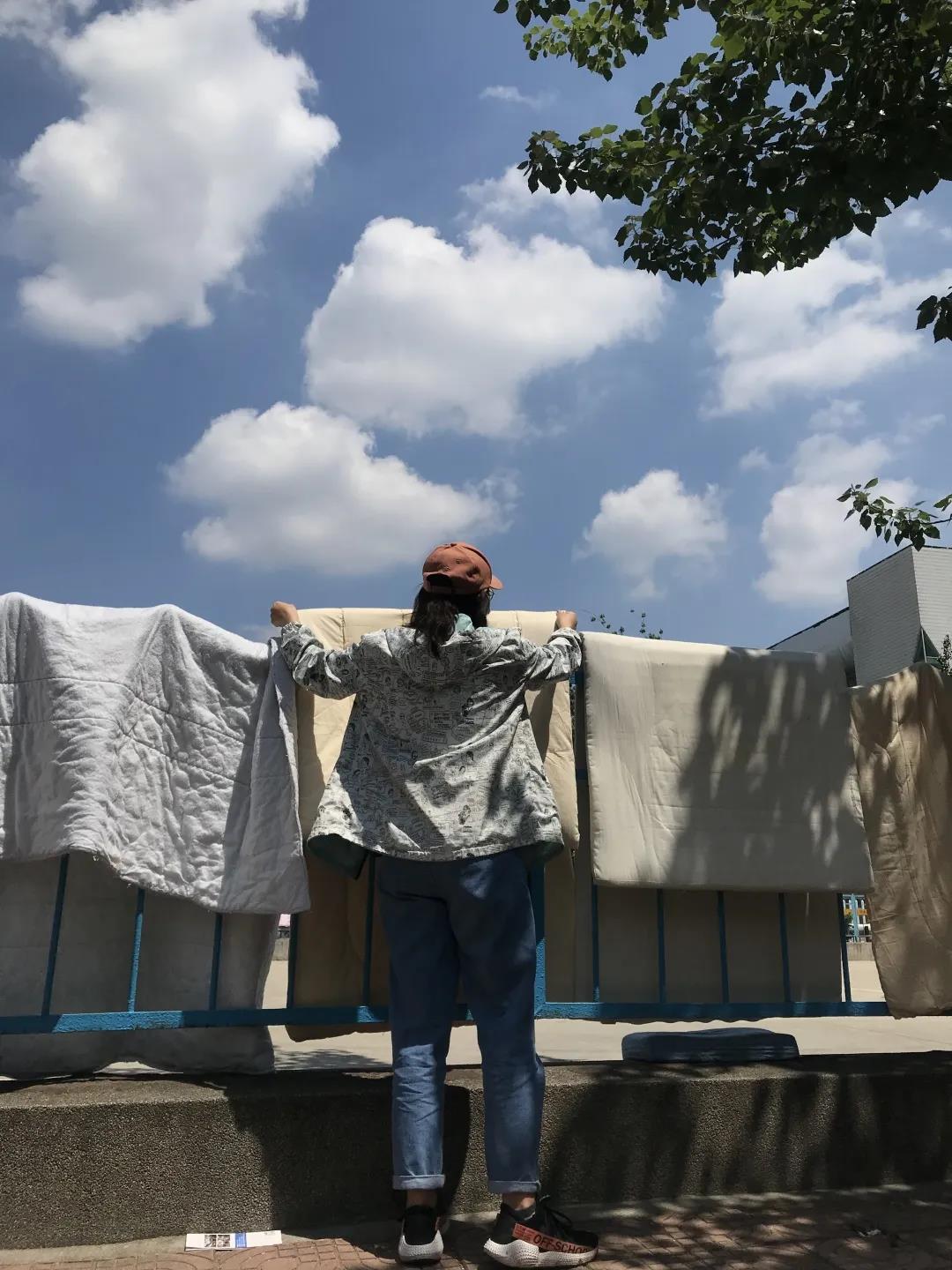 有的将高层宿舍进行开窗通风,有的根据同学们前期所填写的晒被预约申请,一个一个进行打包。辅导员带着我们将被褥一床一床的抱出来晾晒、拍打、拉扯整齐,一条龙服务,保证每一床被褥都能充分接受到阳光的洗礼。