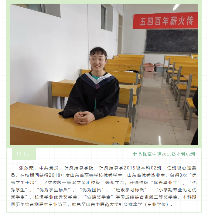 回看大学时光,所有的坚持和努力都有意义。“合抱之木,生于毫末”,医学的积累在于坚持不懈,现在的我仍在努力的路上。未来,我将不断砥砺自己,不忘母校教诲,在新的领域里做出一番新的成就。
