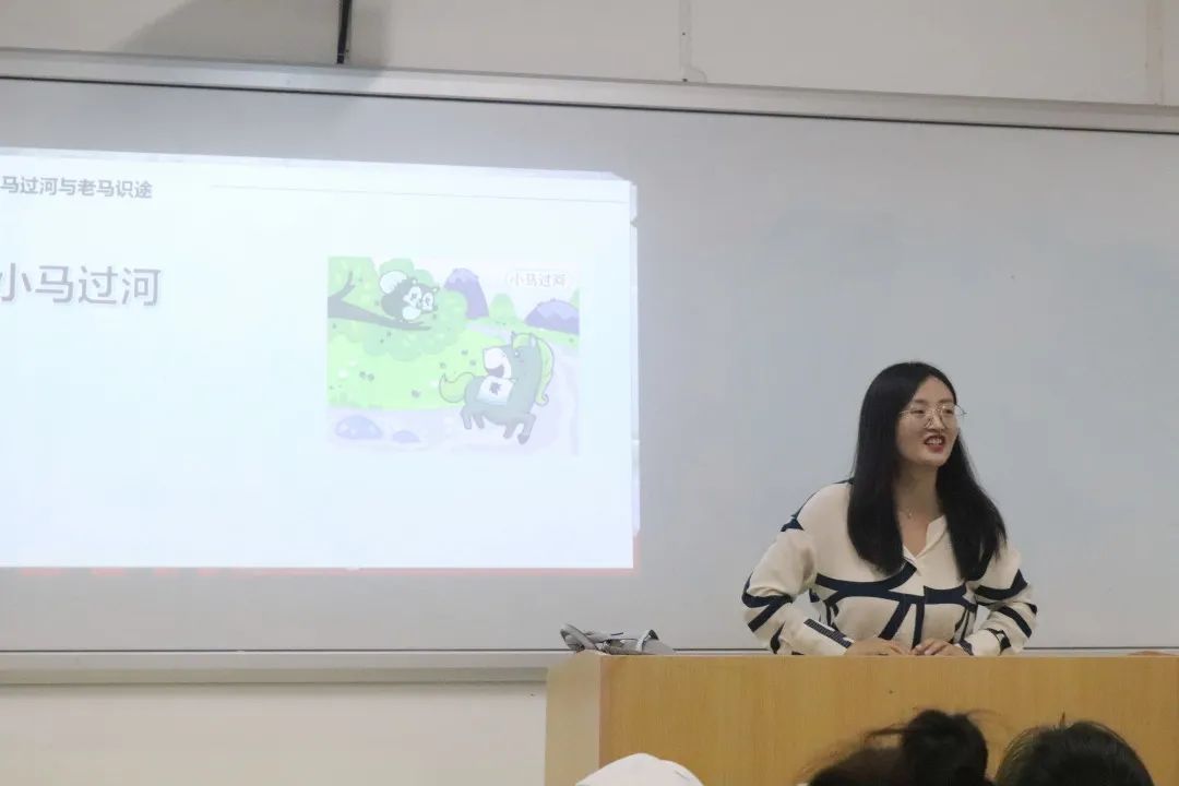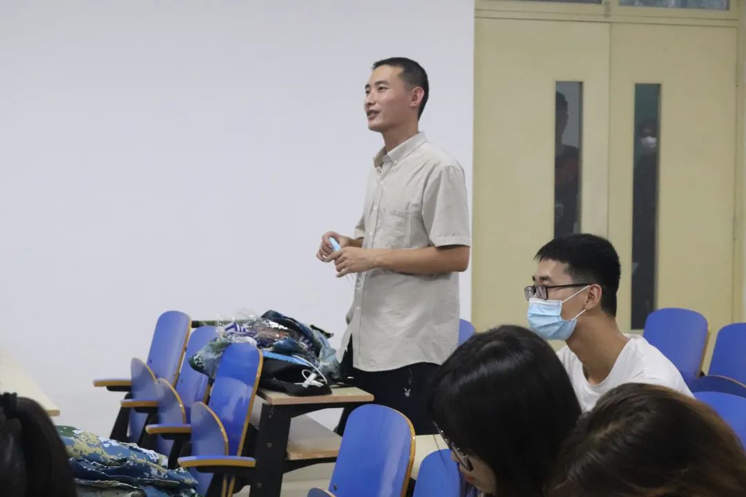 首先,郭立伟老师向新生介绍了自己,并提出了自己对大家的要求:遵守时间、尊重他人。按照规定时间集合,不迟到,有集体意识;尊重自己的老师、带班师哥师姐,有礼貌。接下来郭立伟老师由小马过河和老马识途的寓言故事、典故引入,寓意新生要勇敢尝试,不惧犯错勇敢试错;同时也要善于听取他人意见经验,少走弯路。