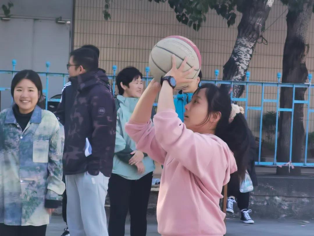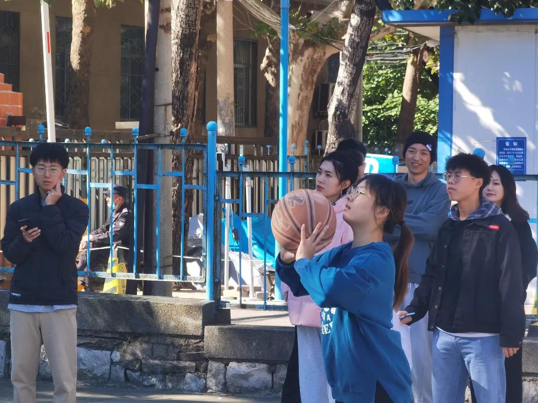 女子在定点投篮的赛场上展飒爽英姿,投篮姿势标准帅气、命中率高,给秋日的校园更添一份活力。