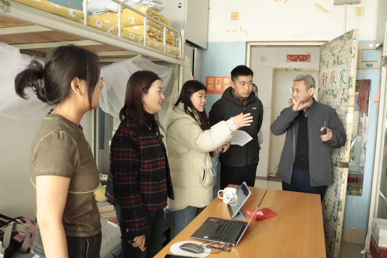 党委书记王锋、党委副书记张继伟、团总支(学工办)副书记(副主任)郭立伟、副科级辅导员宋西鹏、辅导员闫永洁和袁月松对长清校区学生宿舍进行了安全卫生检查。