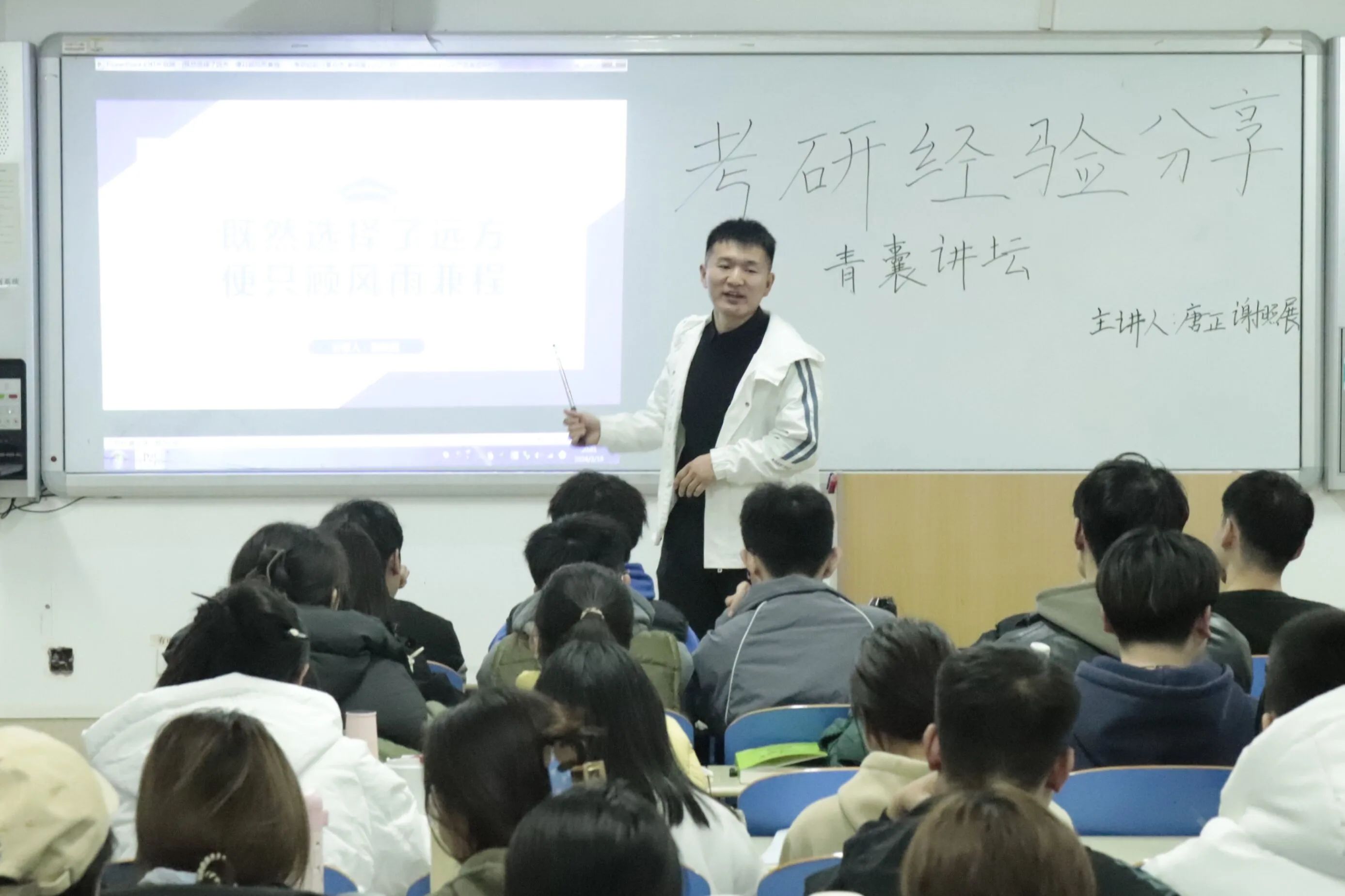 在本次青囊讲坛中,主讲人们结合自身经历,向同学们分享了自己的上岸经验。在场同学受益匪浅,既加深了对于研究生考试的认知,又明确了当下与未来努力的方向。辅导员袁月松出席了本次青囊讲坛,并鼓励大家要坚持到底,为梦想而战。