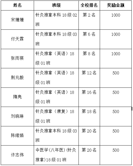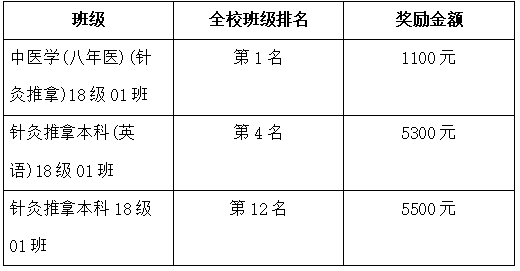 (奖励办法:全校班级通过率排名前50% 的班级,给予班费奖励,按照通过学生人数 *100元标准发放。总分全校前20名的学生授予学习标兵称号,其中前10名学生每人奖励1000元,前11-20学生每人奖励500元。)