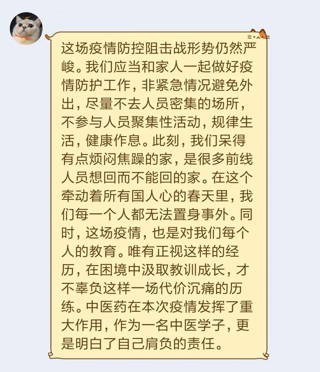 最后,方勇、郑国伟、张紫妞等十余名党员同志踊跃发言,全体党员同志撰写了心得体会,向大家分享了自己的所思所想。从一名学生的义务到一名党员的责任,从自己的所作所为到青年一代的担当,从专业自信到中医药的优势,大家畅所欲言,积极进行思想交流,会议氛围活跃。