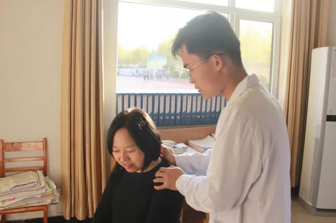 会议结束后,队员们开始了义诊服务。在为老师们进行推拿的过程中,他们根据教师容易颈椎不适的特点,为老师们提供了一些保护颈椎的方法。并为老师们介绍了一些养生知识、简单的推拿手法等等。在义诊期间,队员们还为老师们提供了压耳豆、量血压等服务。
