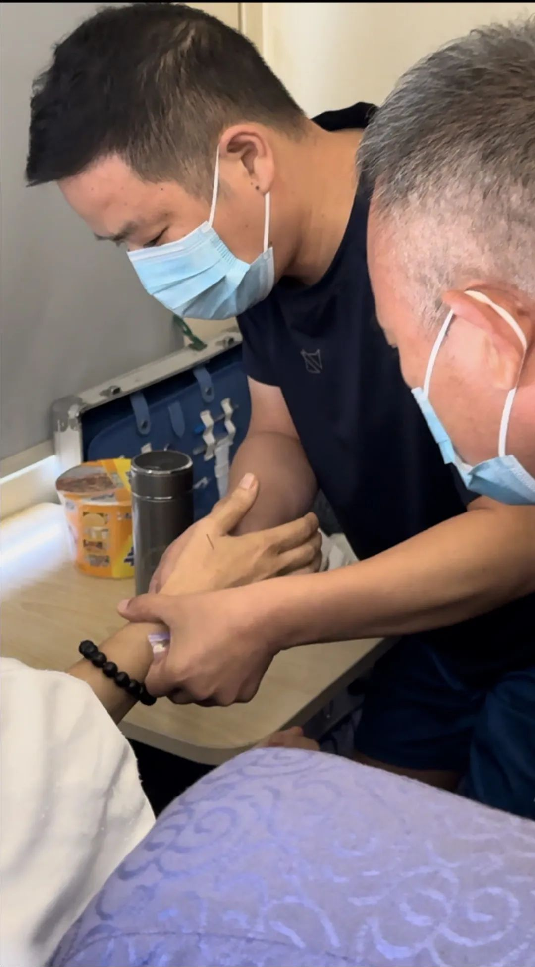 突发疾病旅客为一名50余岁的中年女性。此时正躺在列车上,面色苍白,冷汗淋漓,并有严重的胸痛、胸闷等症状,情况危急。何乃峰老师向病人同行人员详细了解她平素身体情况及用药后,经过舌诊、脉诊,初步诊断为气虚血瘀型胸痹,急需治疗。面对列车上相关药品短缺且新疆境内站间距离较远的不利情况,我校师生充分发挥中医药特色优势,高青老师揿针降压沟,推拿桥弓、率谷穴位,魏文迪博士予针刺合谷、内关、风池20分钟,明鸿权、齐茗、郭文昌等老师及多名同学也在一旁积极配合,救治患者。经过及时诊疗,患者胸痛症状逐渐缓解。