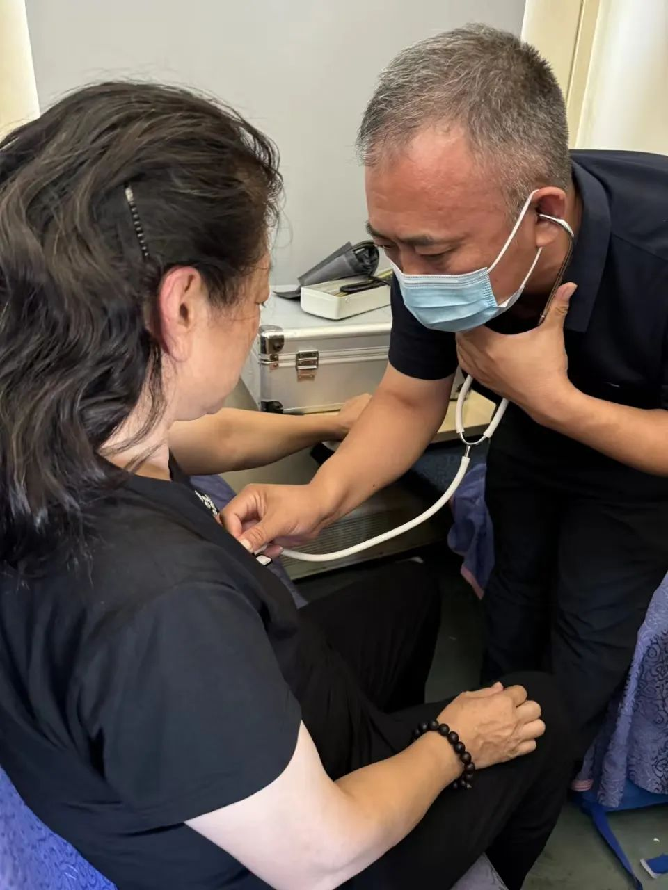 突发疾病旅客为一名50余岁的中年女性。此时正躺在列车上,面色苍白,冷汗淋漓,并有严重的胸痛、胸闷等症状,情况危急。何乃峰老师向病人同行人员详细了解她平素身体情况及用药后,经过舌诊、脉诊,初步诊断为气虚血瘀型胸痹,急需治疗。面对列车上相关药品短缺且新疆境内站间距离较远的不利情况,我校师生充分发挥中医药特色优势,高青老师揿针降压沟,推拿桥弓、率谷穴位,魏文迪博士予针刺合谷、内关、风池20分钟,明鸿权、齐茗、郭文昌等老师及多名同学也在一旁积极配合,救治患者。经过及时诊疗,患者胸痛症状逐渐缓解。